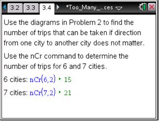 Students will use the general formula for permutations to discover the formula for combinations. They will determine the possible combinations for a committee of 3 people selecting from 6 people. Then students will continue their investigation of the cities by determining the number of trips, where the order of the cities does not matter.