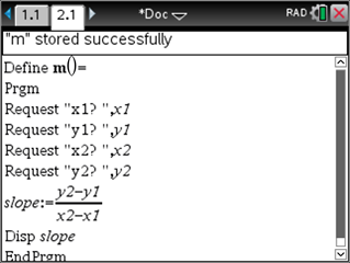 In this post, we will go through a few introductory steps to help you get started writing simple TI-Basic programs on your TI-Nspire CX handheld. We will use a familiar mathematical procedure – computing the slope of a line between two points – to demonstrate computational thinking and a few coding concepts. Expressing a problem and a solution in a way that a computer, or human, can carry it out is computational thinking. Coding on the calculator is one method to give students an opportunity to solidify their understanding of a concept and explore computational thinking. It has a similar effect of asking a student to explain something to one of their peers to make sure they understand it. Coding also gives students valuable exposure to writing programs, which can be a powerful experience.